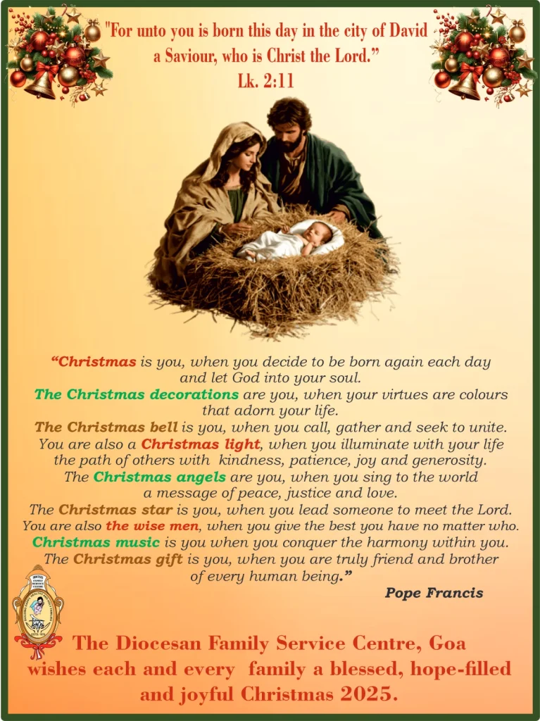 STEWARDSHIP: The Christian Family Movement, India held its annual national convention in Andheri, Mumbai from 15th – 17th August, 2025. During this convention there was an important reflection and discussion on understanding ‘the spirituality of stewardship’ in our families. During, the discussions and evaluations, the families were convinced and filled with the grace of the Holy Spirit to mark their family life with actions of stewardship in our families and neighbourhood. We know that at the heart of the Christmas celebration is the story of the birth of Jesus, a divine gift to humanity, underscoring the importance of sharing and using God’s blessings wisely. Therefore, as catholic families we are called to embrace this gift and embody the principles of stewardship in our lives. We should understand that stewardship is not something that is merely limited to financial contributions, but is a way of life rooted in the belief that everything we have, i.e. our time, talent and treasure is a gift of God. The Christmas season gives us the opportunity and encourages us to allocate time, talent and treasure for our families and others in acts of kindness that helps us to focus on the true meaning of Christmas. Living out the ethics determining the meaning of stewardship during the season of Christmas can be a personal and joyful experience of deepening our relationship with Jesus and giving a witness of the message because of which He became ‘God Emmanuel’.